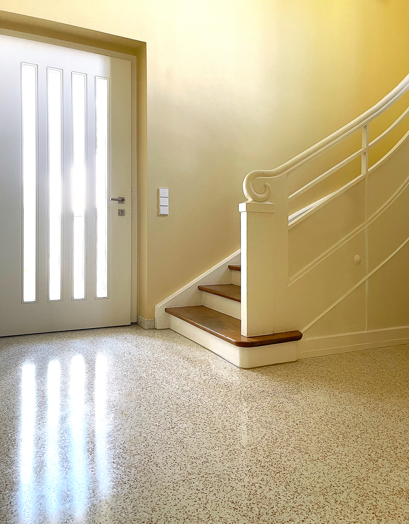 VIA Terrazzo ist ein echter Hingucker – ein kunstvolles Material aus einer Mischung von Steinchips, Marmor, Granit oder Glas, gebunden mit Zement oder Kunstharz. Seine lebendige Optik und individuelle Musterung machen ihn einzigartig. Doch die poröse Oberfläche kann Schmutz und Flecken annehmen. Mit unserer professionellen Reinigung und Politur bringen wir Ihren Terrazzo wieder zum Strahlen und schützen ihn vor zukünftigen Schäden.